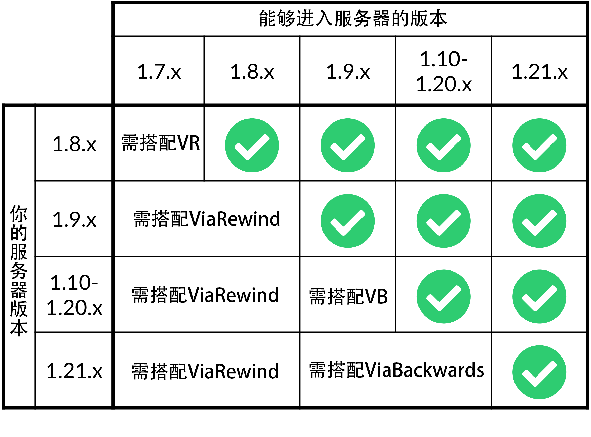 注:ViaVersion 本身只能向前支持,需要向后支持可以使用 ViaBackwards 和 ViaRewind。